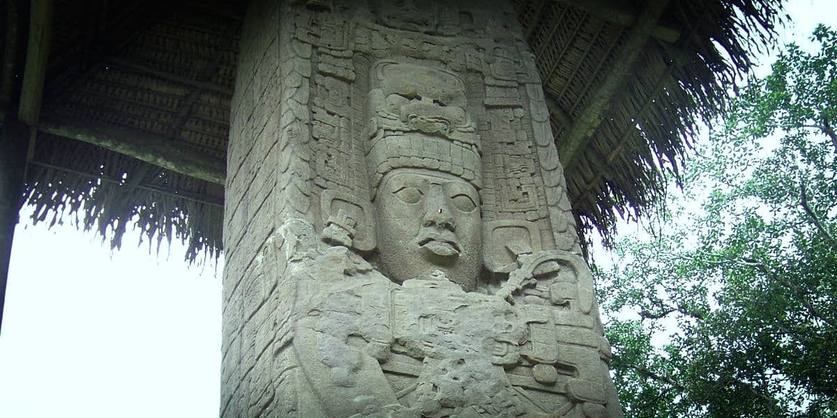 Según Michael Carrasco, los quiasmos también se utilizaron en inscripciones de Palenque, incluido el uso del "quiasmo envolvente", donde el comienzo y el final de un texto forman un quiasmo, para enmarcar tres narrativas históricas diferentes.16 Hopkins y Josserand identificaron lo que es probablemente el ejemplo más elaborado de quiasmo entre las inscripciones mayas clásicas: Estela C de Quiriguá, que presenta un quiasmo de 7 líneas con tres conjuntos paralelos de trillizos, en lugar de la pareja usual, en el medio.17